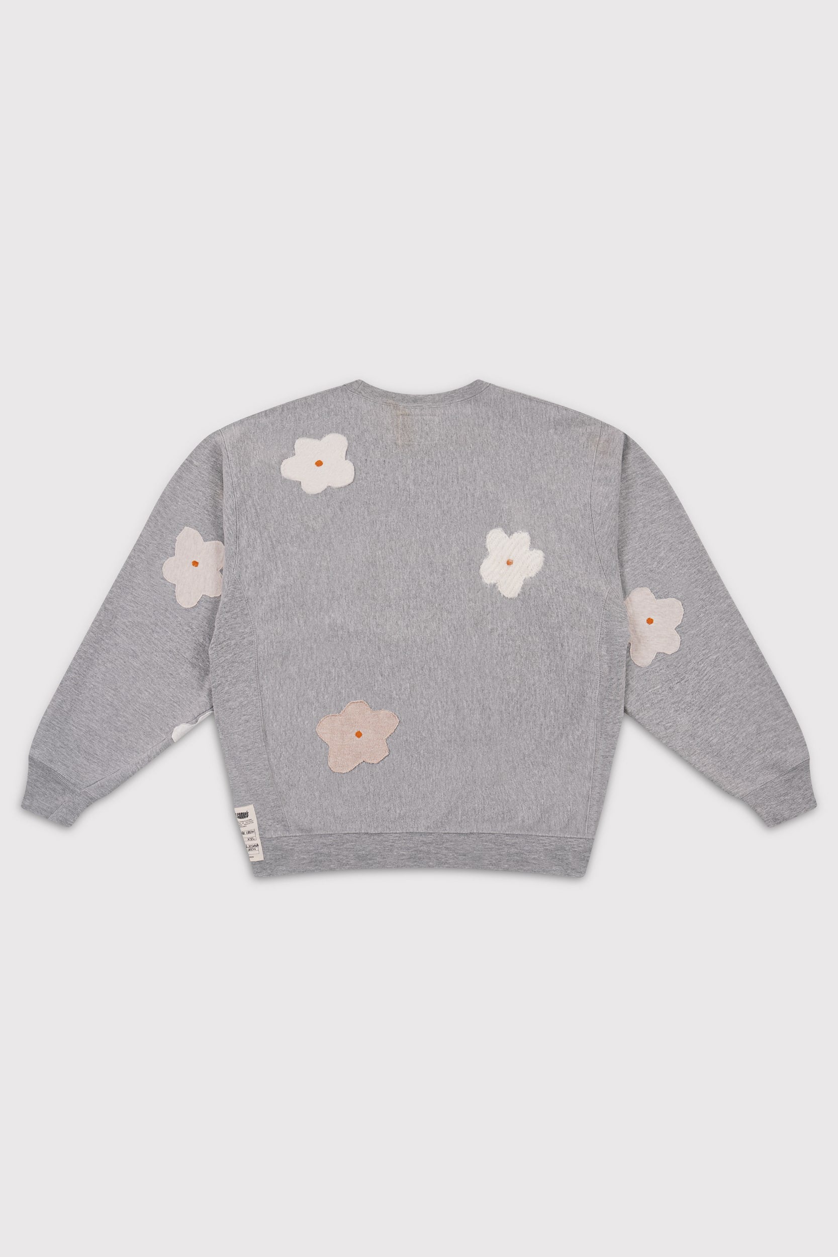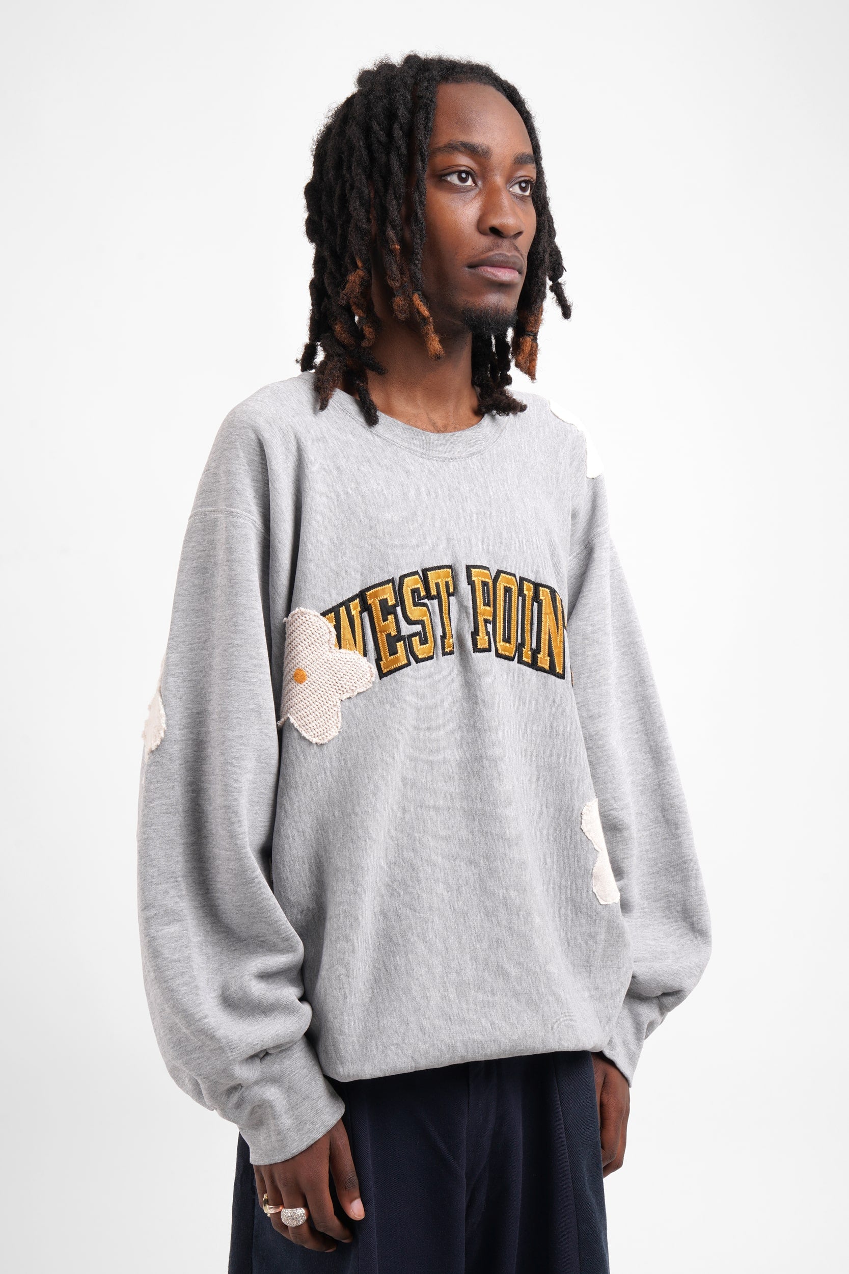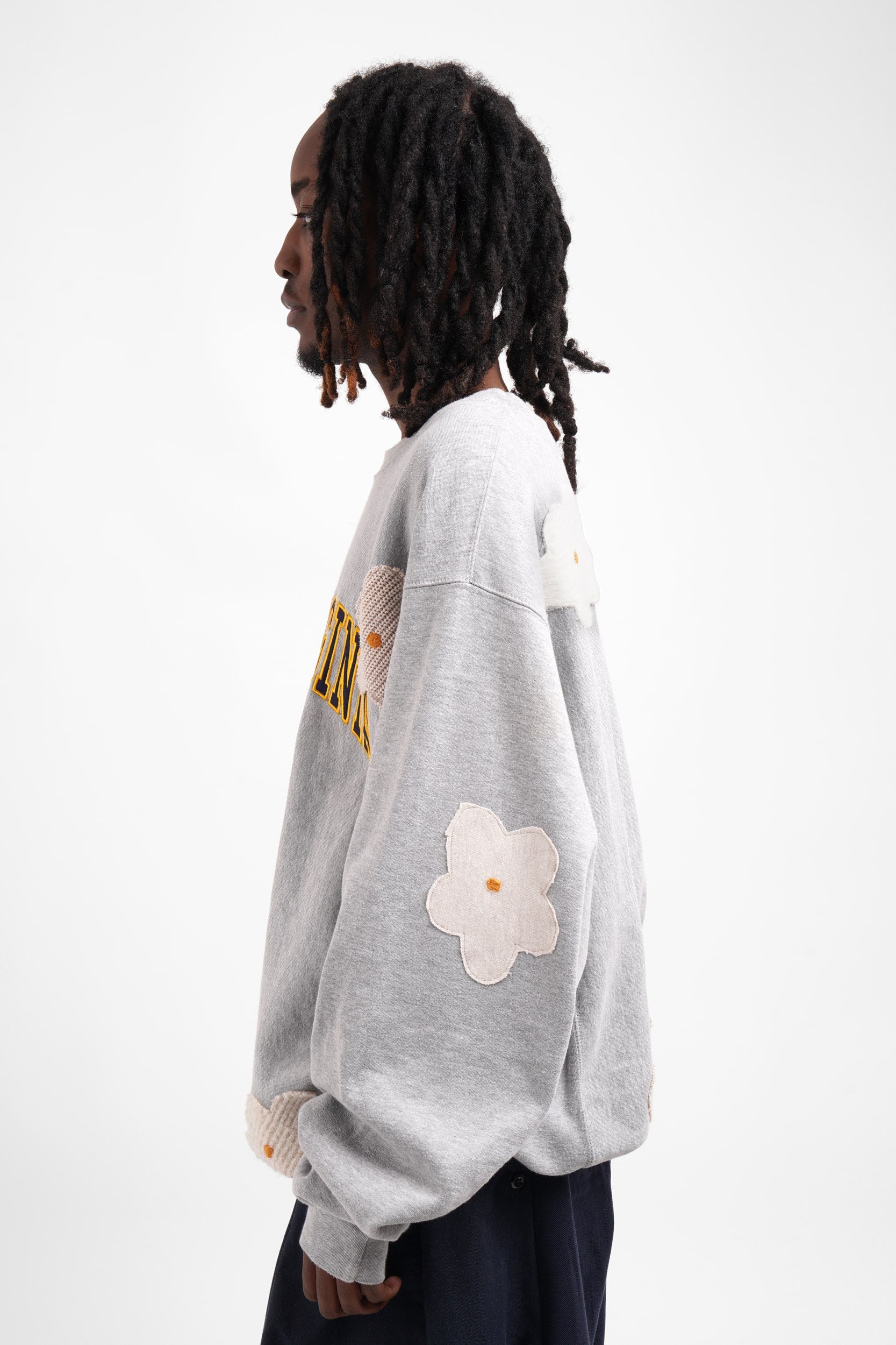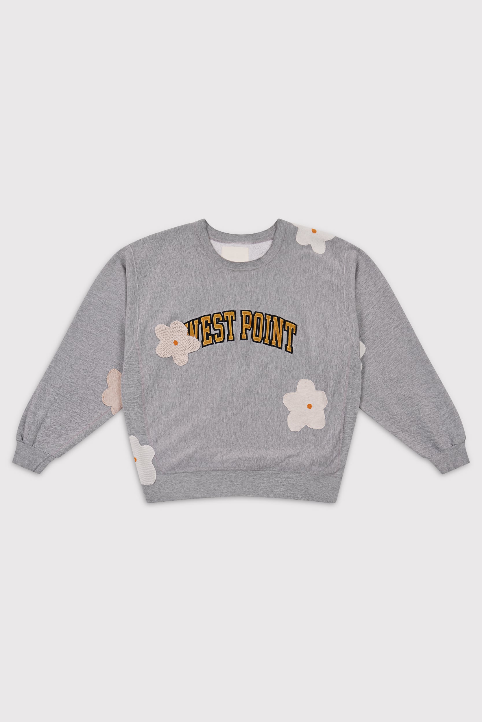 Each Flower Crew is crafted from a carefully curated, true vintage U.S. team crewneck sweatshirt. While all are grey, the front features different team embroideries, prints and appliqués, making no two exactly alike.