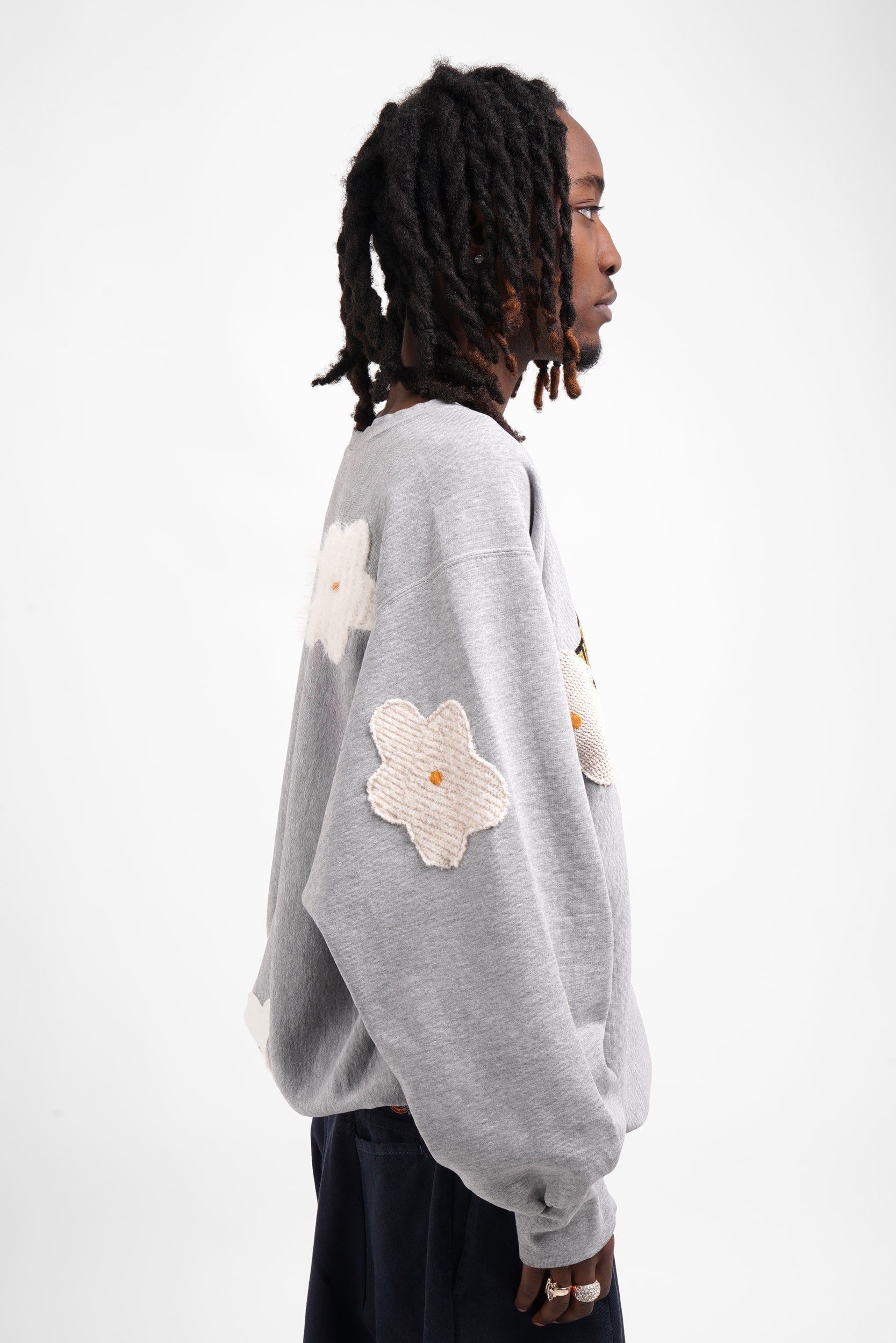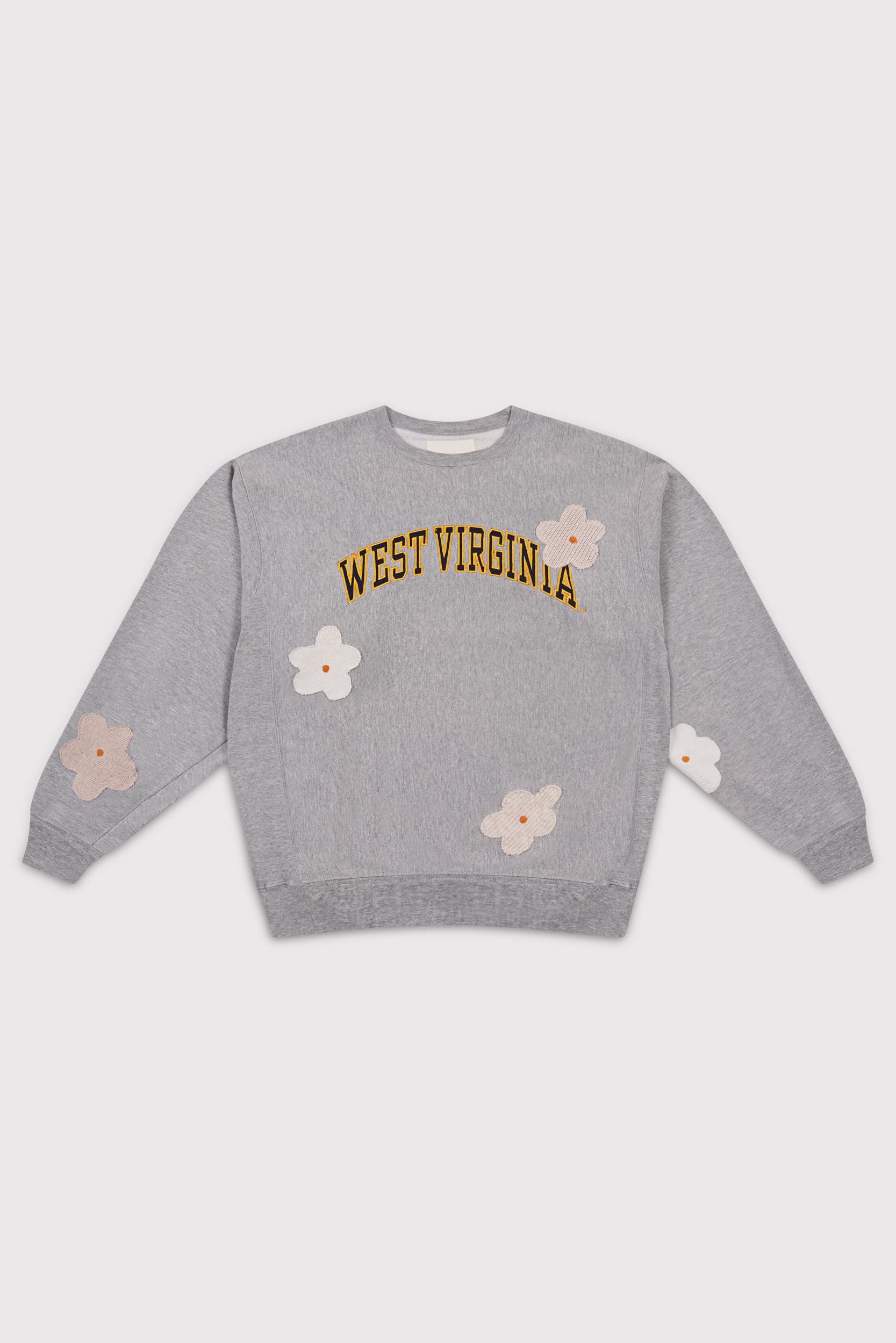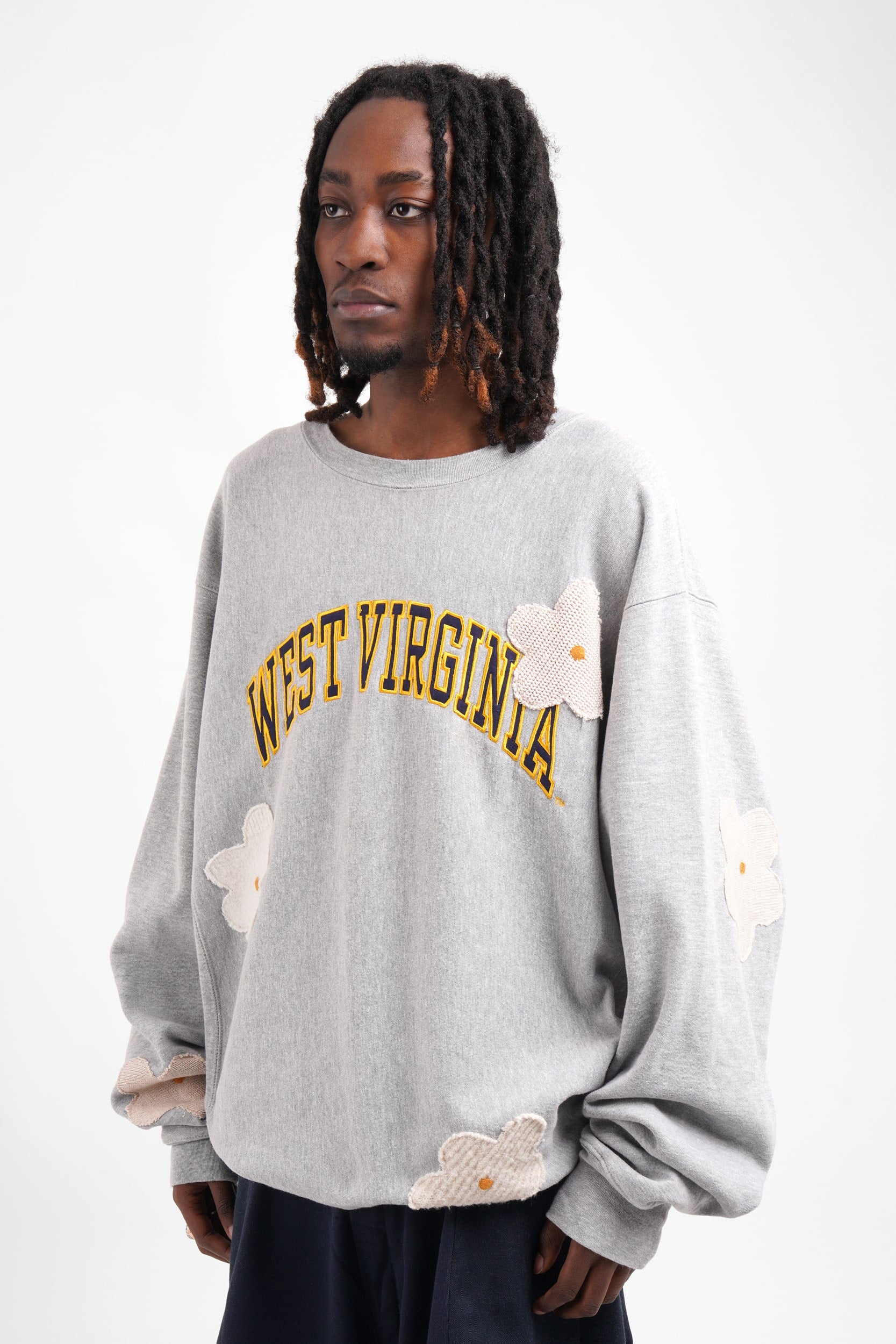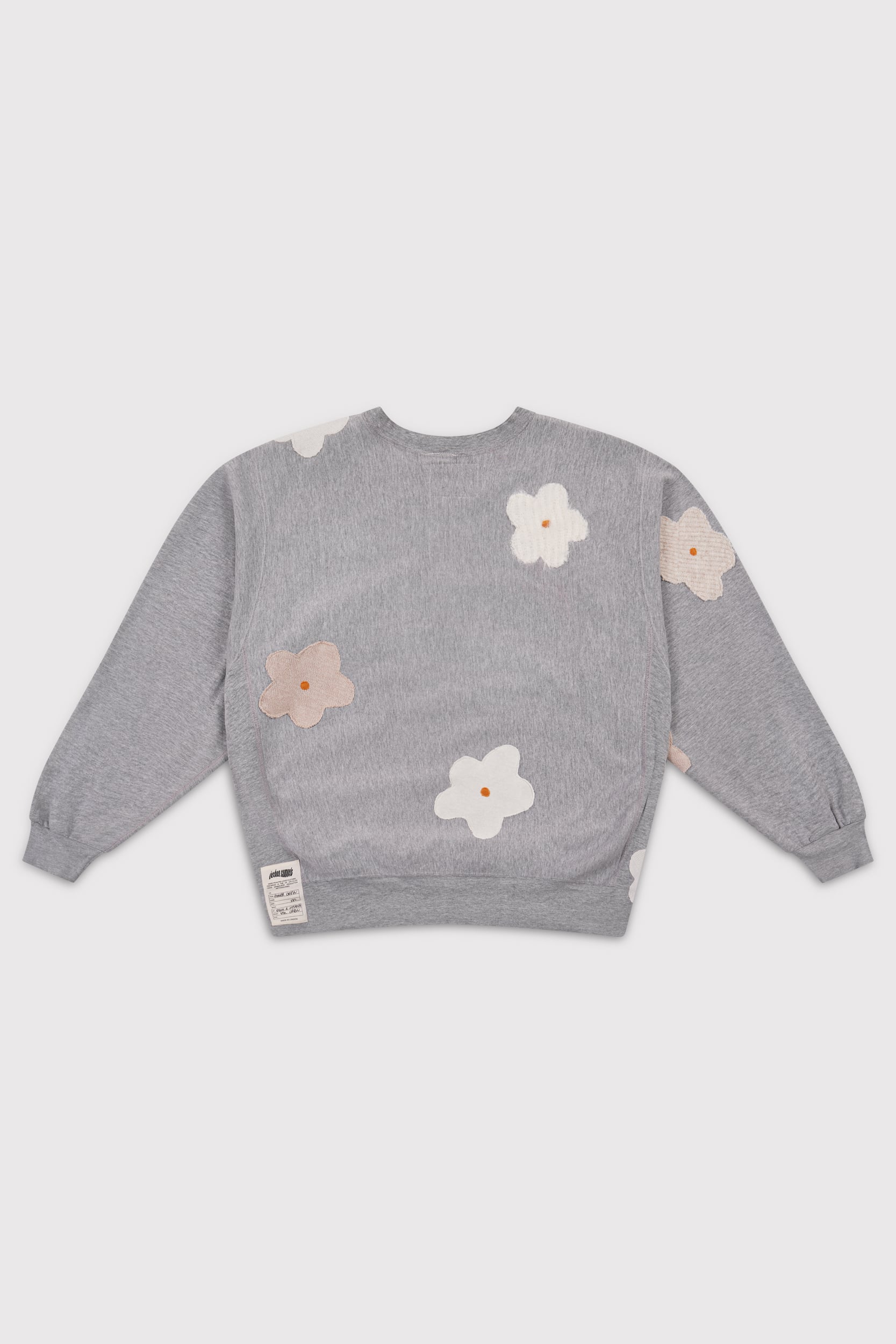 Each Flower Crew is crafted from a carefully curated, true vintage U.S. team crewneck sweatshirt. While all are grey, the front features different team embroideries, prints and appliqués, making no two exactly alike.