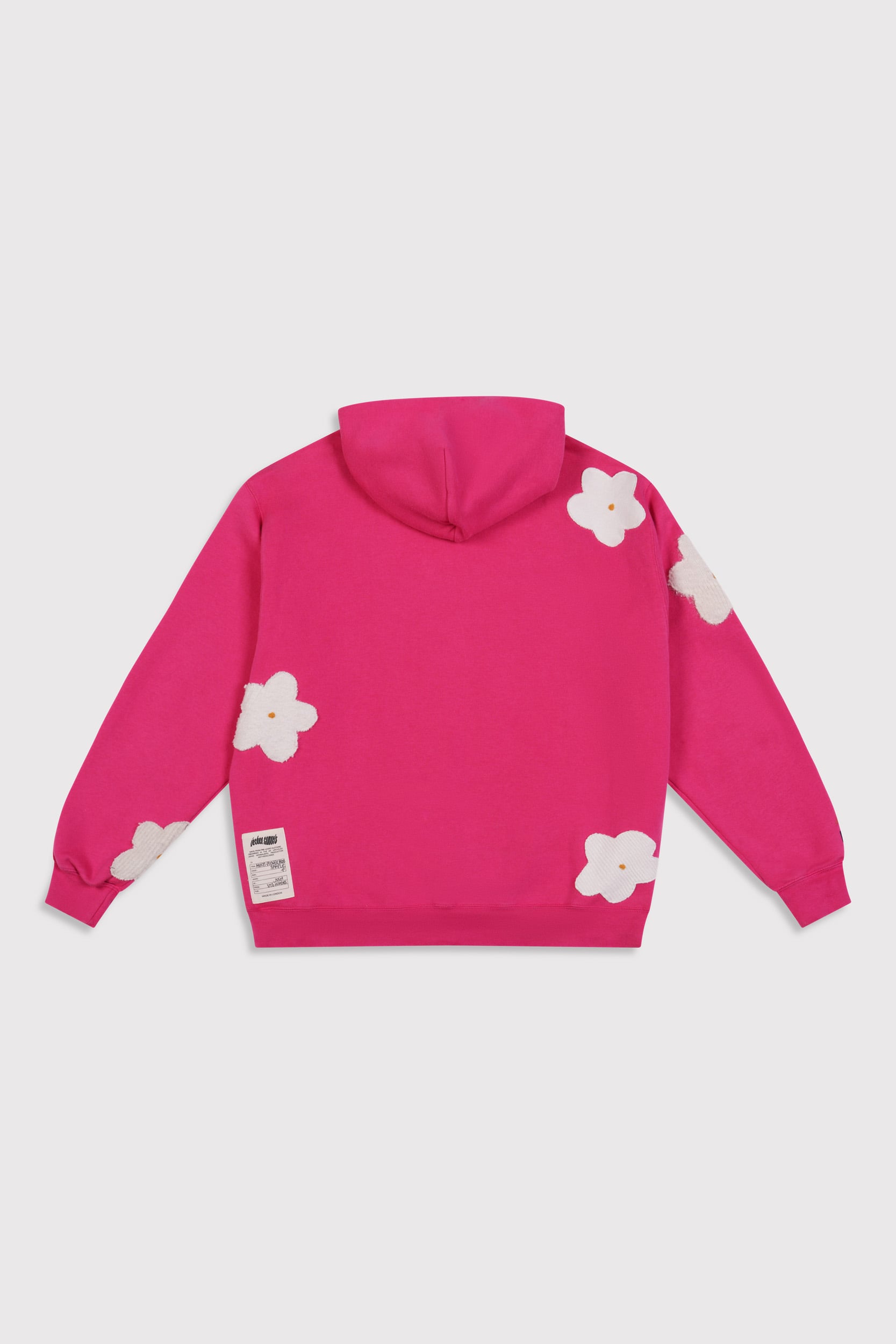 Each hoodie is adorned with hand-cut floral appliqués, made from a selection of vintage cream knits.