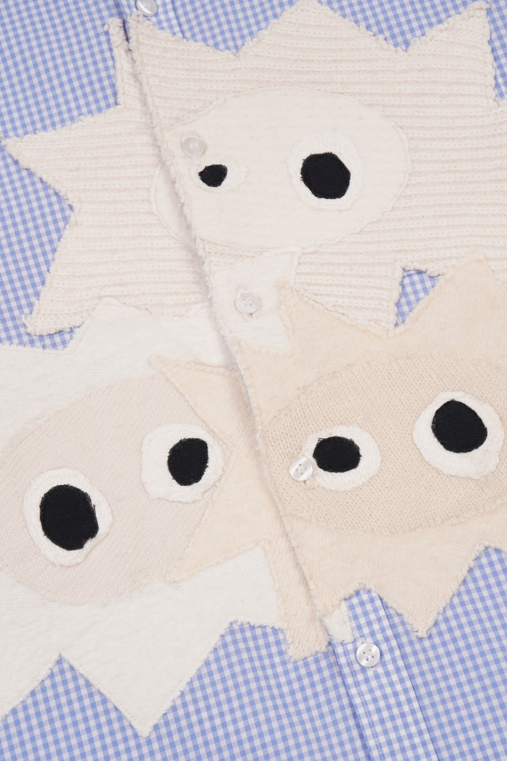 Adorned with 3 hand-cut Whimsical Little Buggers appliqués, made from a curated selection of cream vintage knits in various tones and textures.