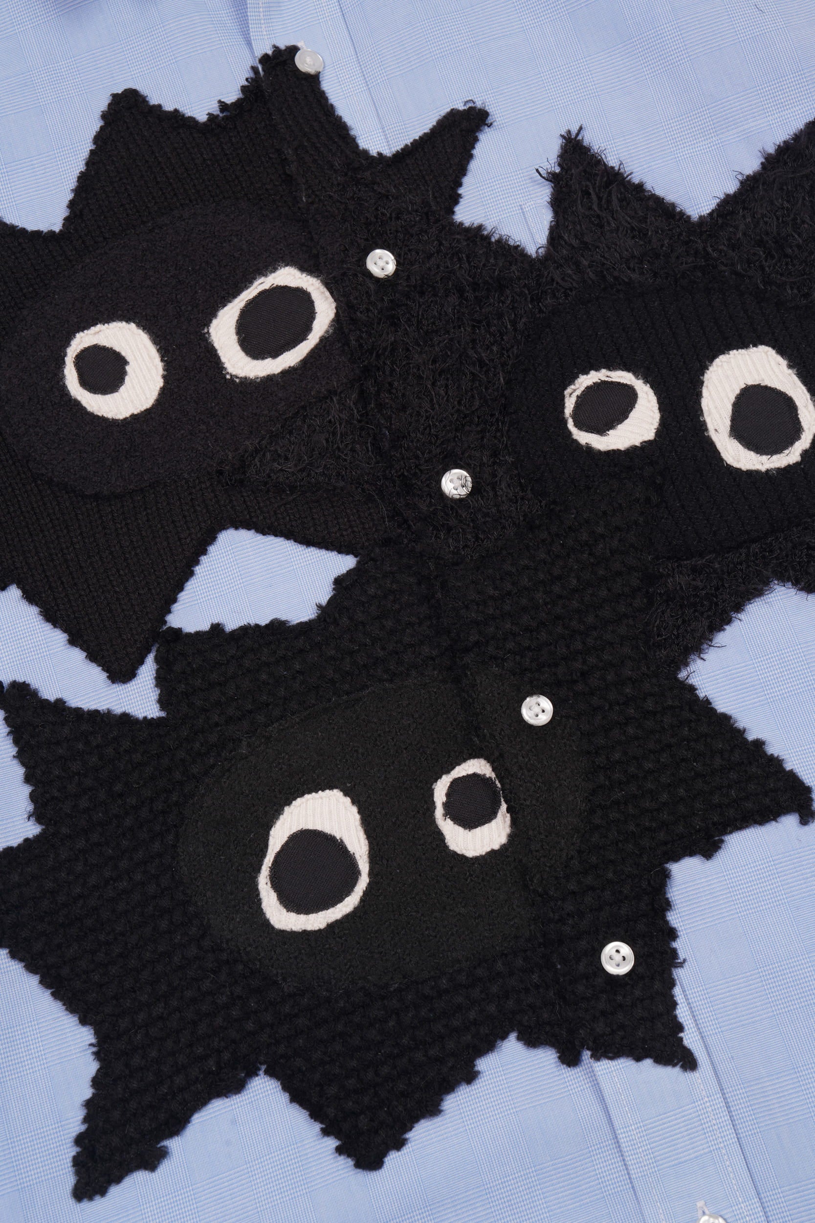 Adorned with 3 hand-cut Whimsical Little Buggers appliqués, made from a curated selection of black vintage knits in various tones and textures.
