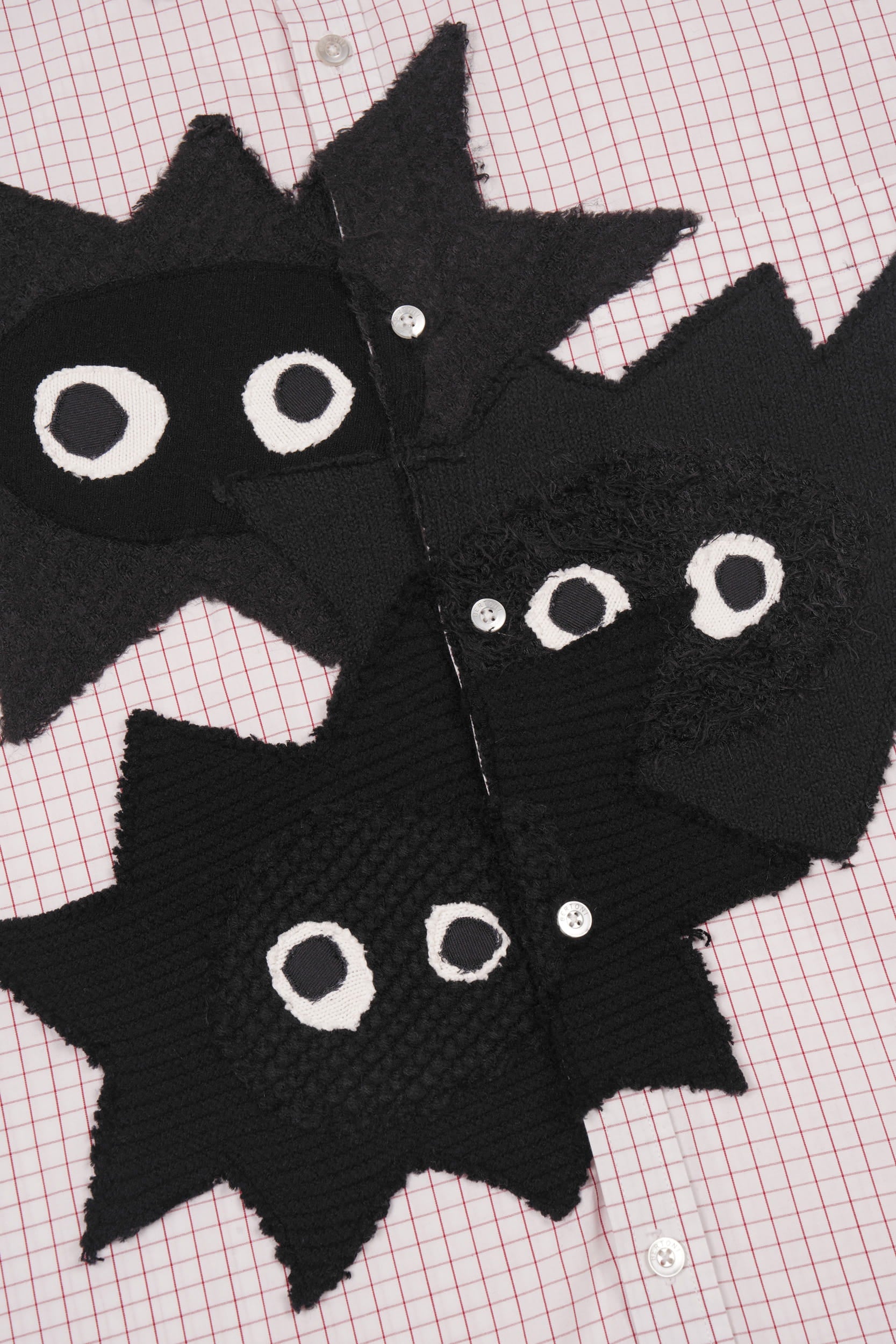 Adorned with 3 hand-cut Whimsical Little Buggers appliqués, made from a curated selection of black vintage knits in various tones and textures.